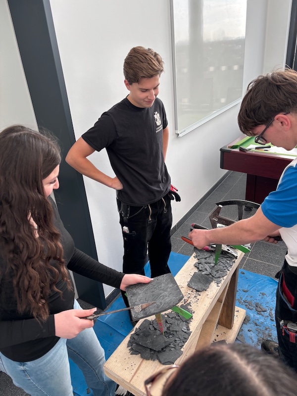 Die jungen BotschafterInnen wussten spannend und interessant aus zahlreichen unterschiedlichen Ausbildungsberufen zu berichten. Und unsere RealschülerInnen nutzten die Gelegenheit, Fragen zu stellen, sich Tipps zur Berufsorientierung zu holen und aus erster Hand zu erfahren, wie sich Ausbildung „anfühlt“. Besonders begehrt war „Dächer für Düsseldorf: Hier konnten die SchülerInnen bei vielen praktischen Übungen den Beruf des Dachdeckers besser kennenlernen.