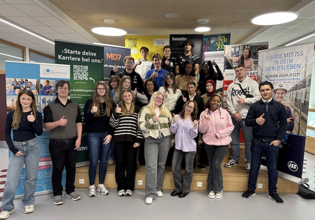 Welch ein Luxus! Statt durch ganz Düsseldorf und Umgebung zu fahren und Betriebe auf der Suche nach Informationen auf eigene Faust „abzuklappern“, bekamen die Jugendlichen der Stufen 9 und 10 dieses Info-Paket direkt bei uns: Die Ausbildungsbotschafterinnen und -Botschafter besuchten sie in unserer Schule!