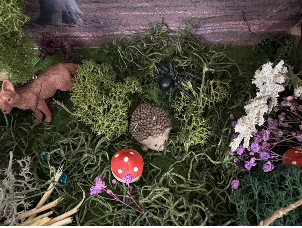 Schülerinnen und Schüler des Biokurses der Stufe 7 machten sich direkt ans Werk und schufen phantasievolle Mini-Wälder mit Pflanzen, Tieren und anderen Dingen, die man im Wald finden kann. Naturmaterialien wie Blätter, Moos und kleine Zweige wurden dabei kreativ kombiniert mit Gummitieren und gestalteten Bäumen und Sträuchern aus Pappe.