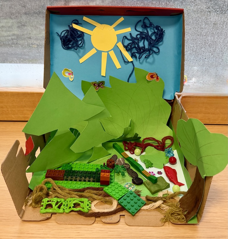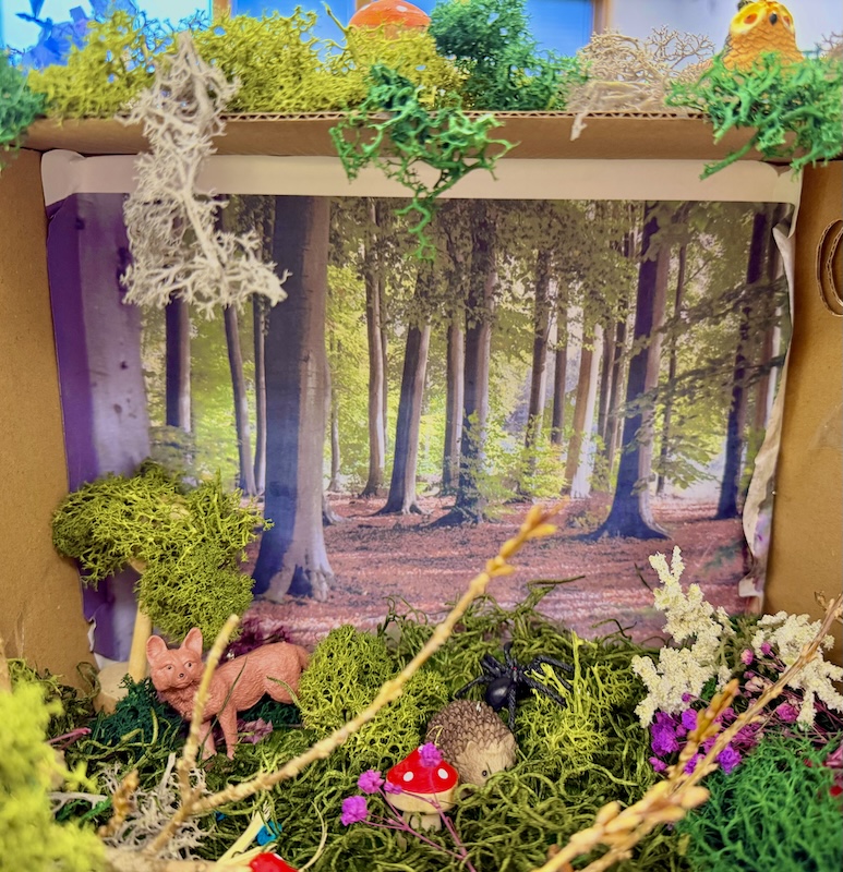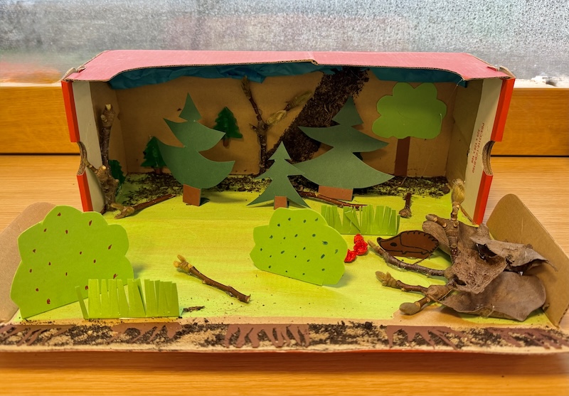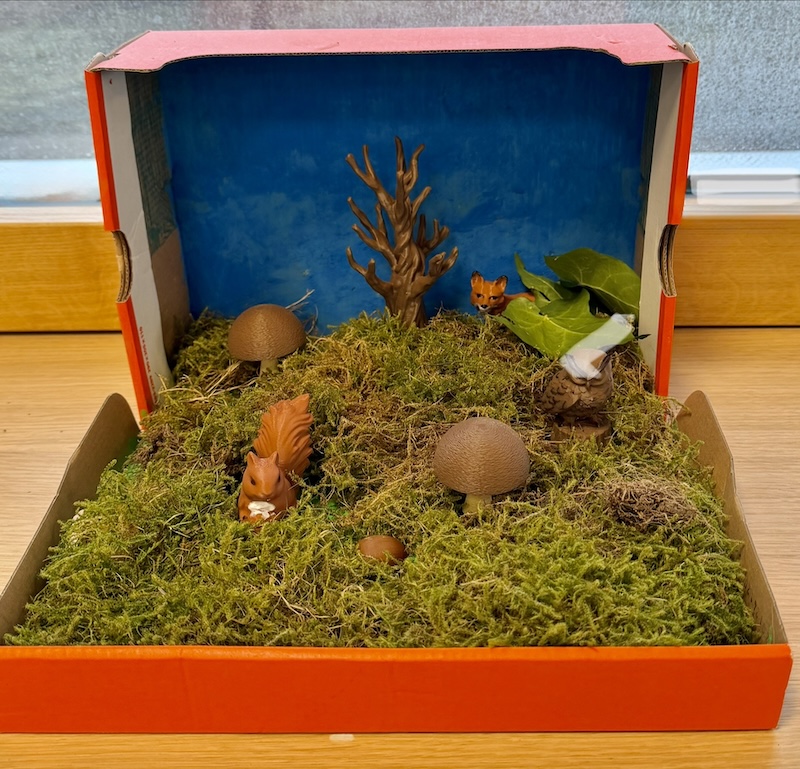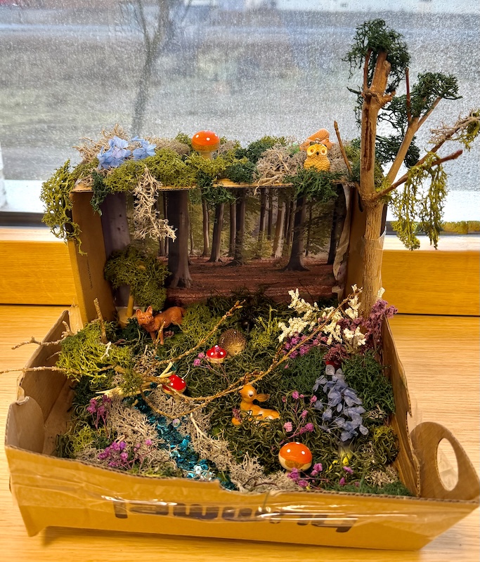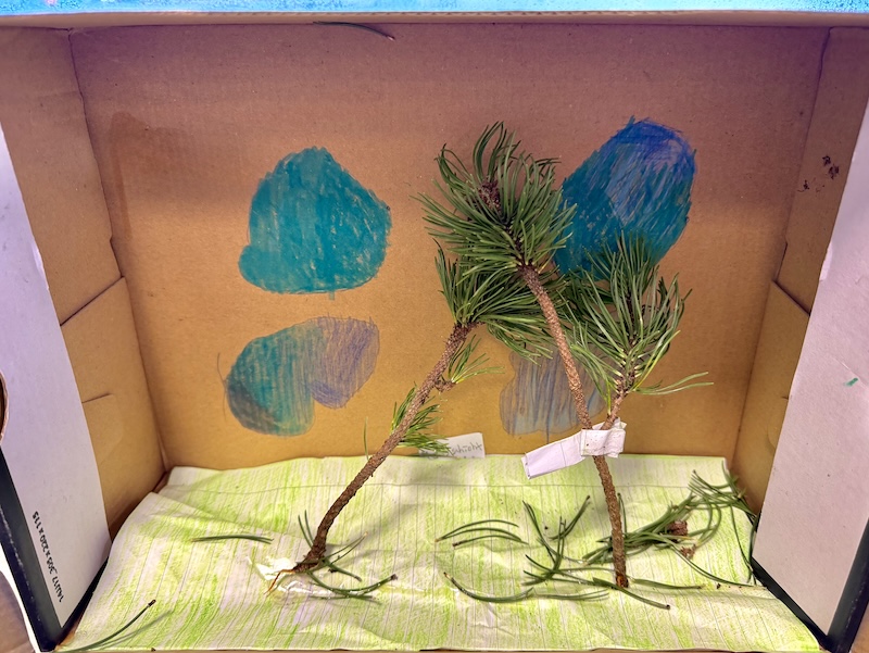 Dabei herausgekommen sind hübsche kleine Kunstwerke, die sich gut als Dekoration auf dem Schreibtisch oder im Regal machen. Die Kids können stolz sein auf ihre „Wälder im Schuhkarton“, die hier zu bewundern sind.
