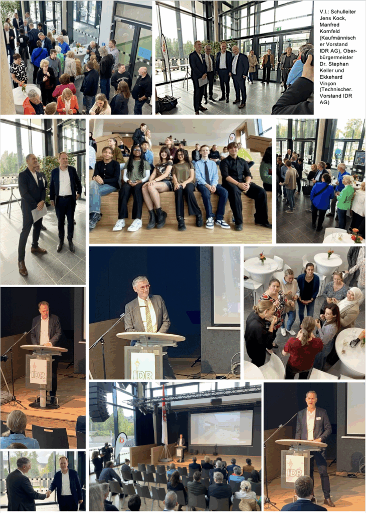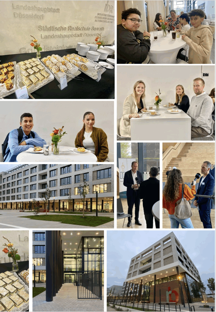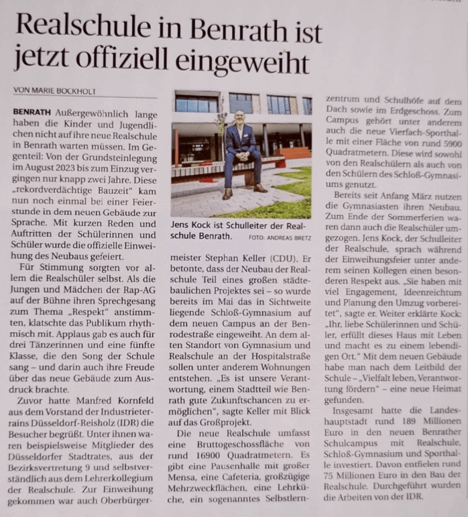 Dr. Stephan Keller, Manfred Kornfeld und auch unserem Schulleiter Jens Kock war es wichtig, sich bei allen herzlich zu bedanken, die dabei mitgewirkt haben, dass die größte Realschule Düsseldorfs nun ein echtes Schmuckstück für Benrath und Düsseldorf ist. Ihr Dank galt vor allem dem Düsseldorfer Amt für Schule und Bildung – hier vor allem Frau Deuß und Frau Dürr und ihrem gesamten Team. „Diese Schule wurde mit Herzblut und Leidenschaft gebaut“, betonte der Oberbürgermeister Dr. Stephan Keller. Schulleiter Jens Kock zollte ihm Respekt für „Ihren Mut und Ihre Weitsicht, das Schulprojekt umzusetzen“. Jetzt, so ergänzte IDR-Vorstand Manfred Kornfeld, stehe das Schulgebäude vor seiner Bewährungsprobe, das Schulmotto „Vielfalt leben, Verantwortung fördern“ im Alltag umzusetzen und den Räumen Leben einzuhauchen.