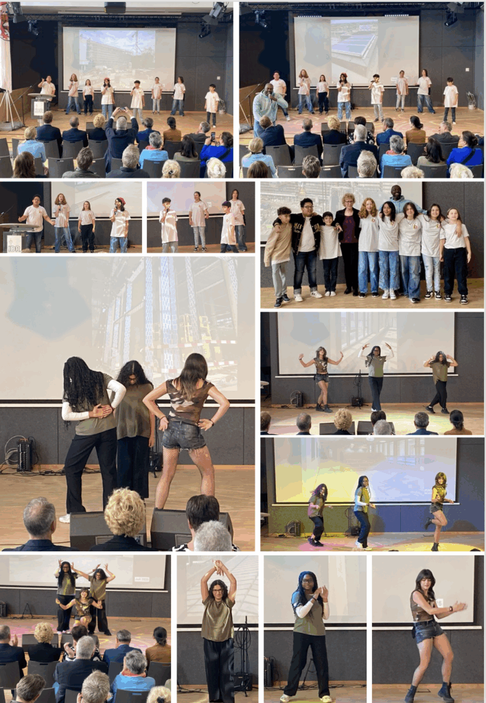 Natürlich wurde bei der großen Einweihungsfeier nicht nur geredet, das Buffet genossen und geplaudert. Mit drei „Special Acts“ präsentierten SchülerInnen verschiedener Jahrgangsstufen auf der schicken neuen Bühne in der Aula ihr Können. Den Anfang machte der Rapper Nimoh, der mit Kids aus der 6. Klasse einen tollen Rap zum Thema „Respekt“ aufführte. Das Dance-Trio CRAZTEEN führte einen mitreißenden Tanz auf und wurde stürmisch bejubelt. Und der Chor der Stufe 5 – gerade mal einen Monat an unserer Schule, gaben sie mit ihrer Musiklehrerin Carola Meyer unseren Schulsong zu Besten – mit einer neuen Strophe, in der sie ein Highlight der Schülerinnen und Schüler feierten: die Frühstückspause auf dem Dachschulhof. Text & Fotos: krs