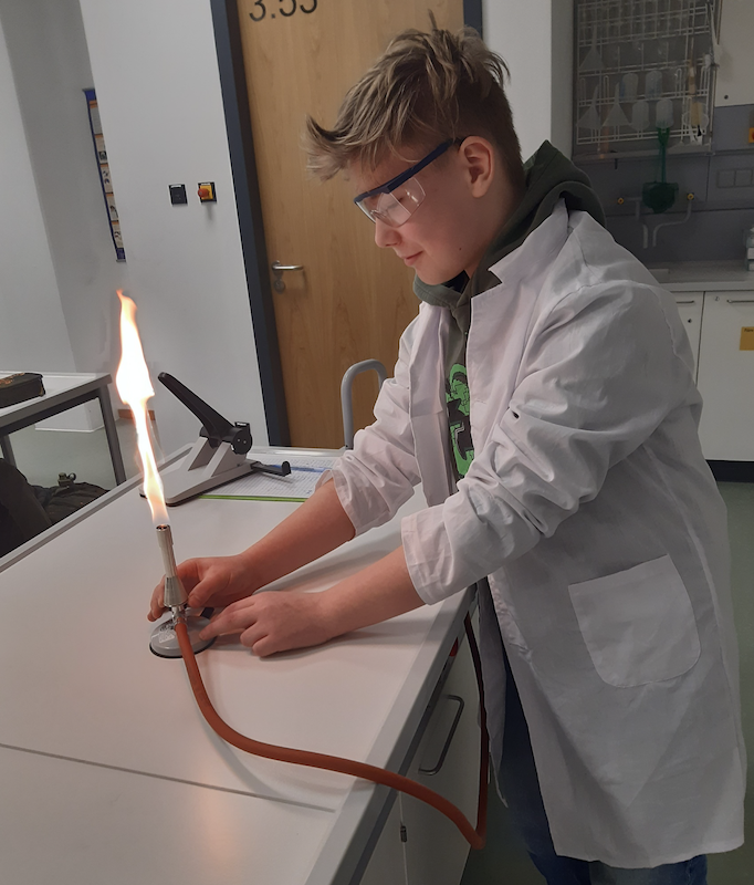 Ein halbes Jahr mussten sie auf diesen Tag warten. Der Grund: Die Gasbrenner wurden erst kurz vor Weihnachten geliefert. Zwar soll ja die Vorfreude die beste Freude sein, aber als der „Tag des Brennerführerscheins“ endlich da war, strahlten die Schülerinnen und Schüler des Kurses WP Chemie 7 um die Wette.