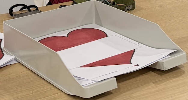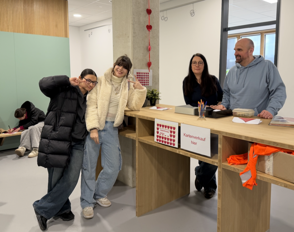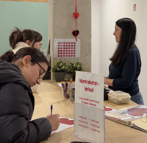 Frau Nykodym-Öland von der Schulsozialarbeit hatte in den Schulpausen alle Hände voll mit dem Verkauf der kreativ gestalteten Herzkarten zu tun. Wer eine Karte kaufte, schrieb einen Gruß hinein und legte ihn dann in die „Versandkiste“ – natürlich blieb der Inhalt geheim. 🤫